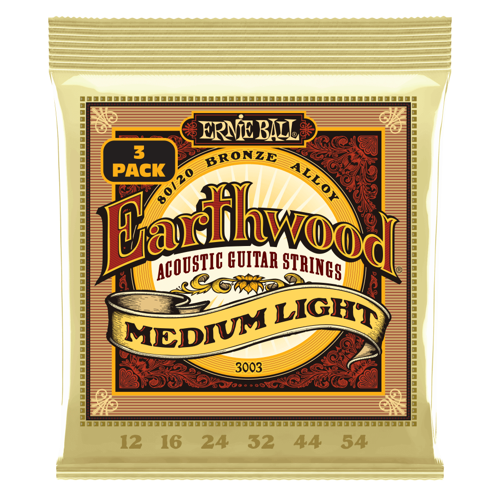 Now available in convenient three-set packs. Ernie Ball Earthwood 80/20 Bronze Acoustic Guitar Strings are made from 80% copper, 20% zinc wire wrapped around hex shaped brass plated steel core wire. These acoustic guitar strings provide a crisp, ringing sound with pleasing overtones. Gauges .012, .016, .024w, .032, .044, .054