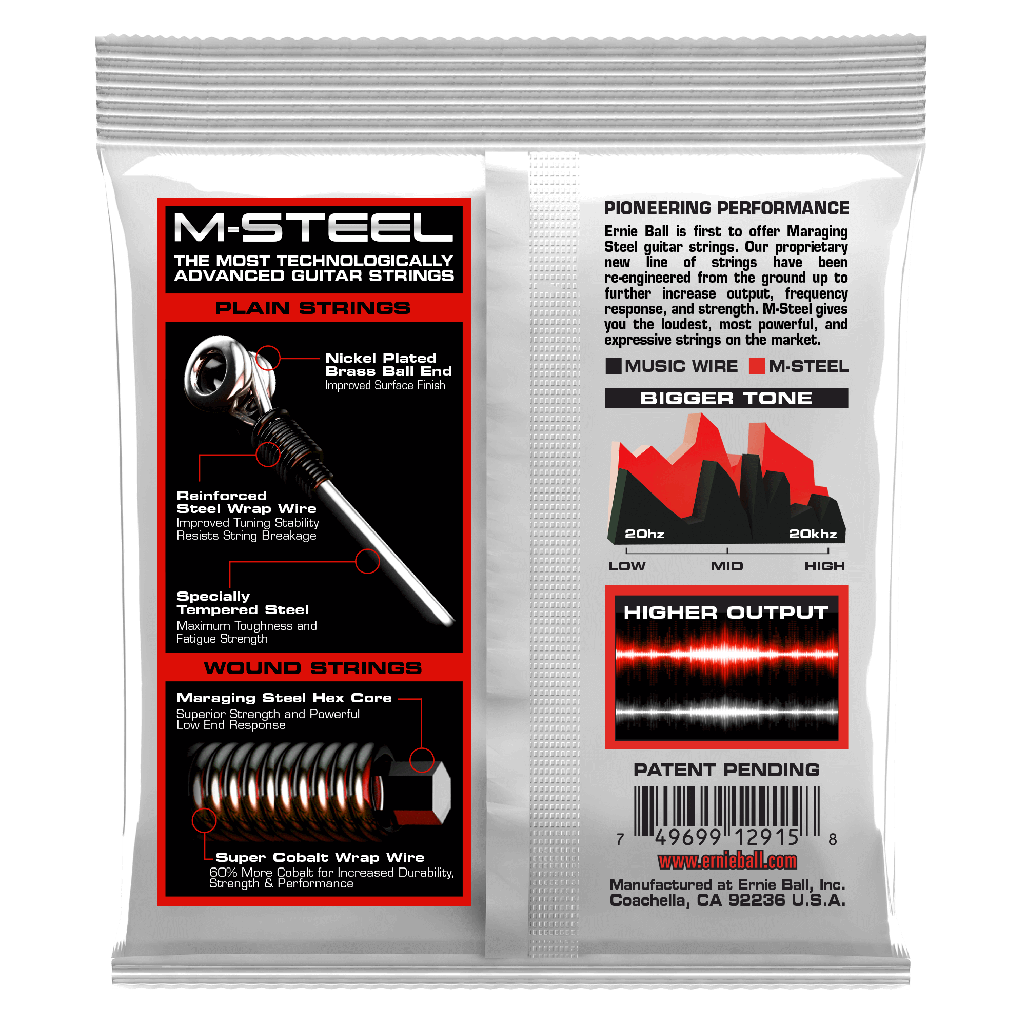 Ernie Ball M-Steel electric guitar strings are made of a patented Super Cobalt alloy wrapped around a Maraging steel hex core wire, producing a richer and fuller tone with a powerful low-end response. M-Steel plain electric guitar strings are comprised of a specially tempered steel for maximum fatigue resistance. The electric plain strings also utilize a patented winding of steel around the ball end that reduces slippage, breakage and stays in tune better than conventional plain strings. Gauges .010, .013, .017, .030, .042, .052