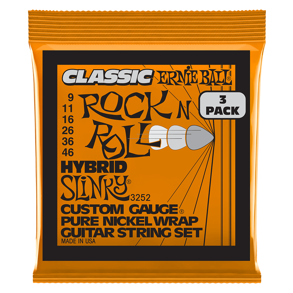 Now available in convenient three-set packs. Ernie Ball Slinky Classic Rock N Roll Pure Nickel wrap electric guitar strings are made from pure nickel wire wrapped around tin plated hex shaped steel core wire, these guitar strings produce a warm rich tone with that signature Slinky feel. Gauges .009, .011, .016, .026, .036, .046