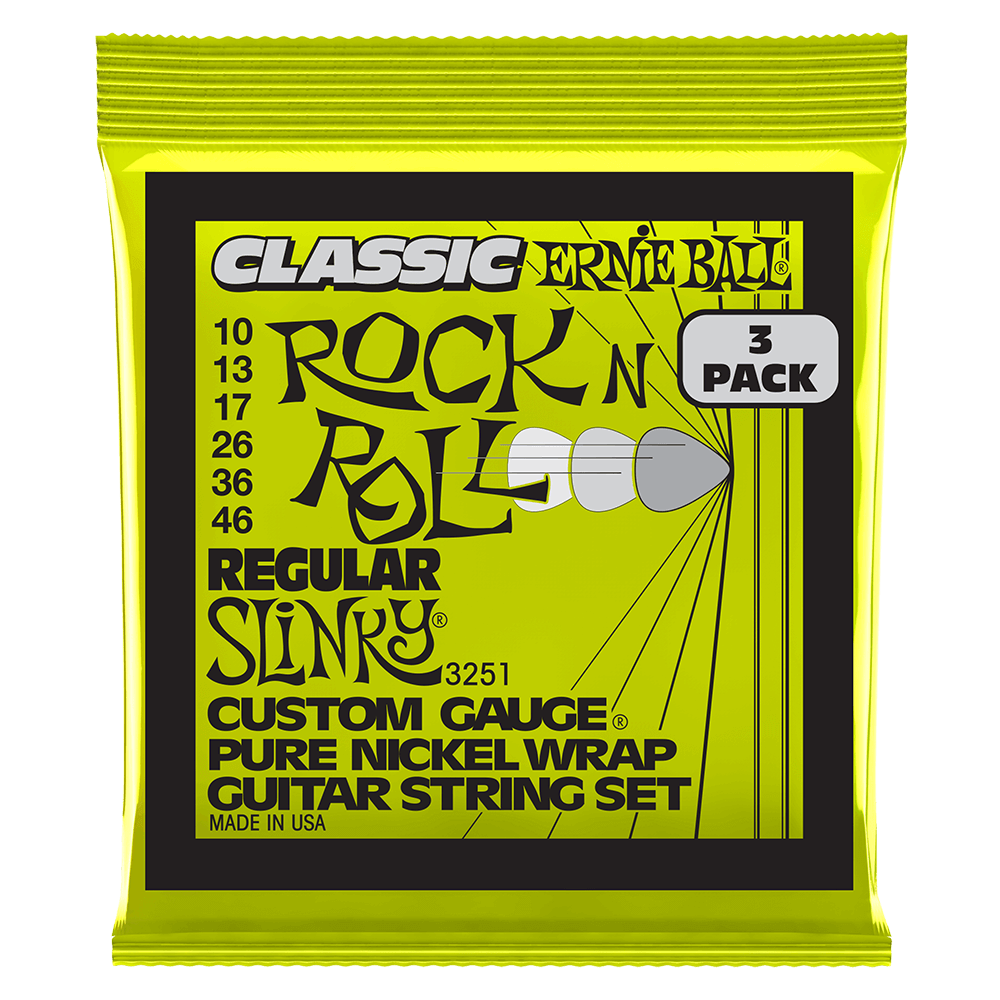 Now available in convenient three-set packs. Ernie Ball Regular Slinky Classic Rock N Roll Pure Nickel wrap electric guitar strings are made from pure nickel wire wrapped around tin plated hex shaped steel core wire, these guitar strings produce a warm rich tone with that signature Slinky feel. Gauges .010, .013, .017, .026, .036, .046