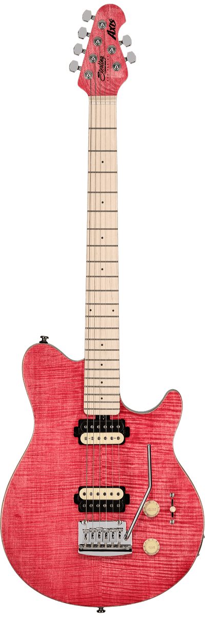 The Sterling By Music Man Axis AX3 in Stain Pink is where artistry meets performance. This isn't just another electric guitar – it's a masterpiece featuring a breathtaking flame maple top with a unique stain pink finish that's guaranteed to turn heads wherever you play.