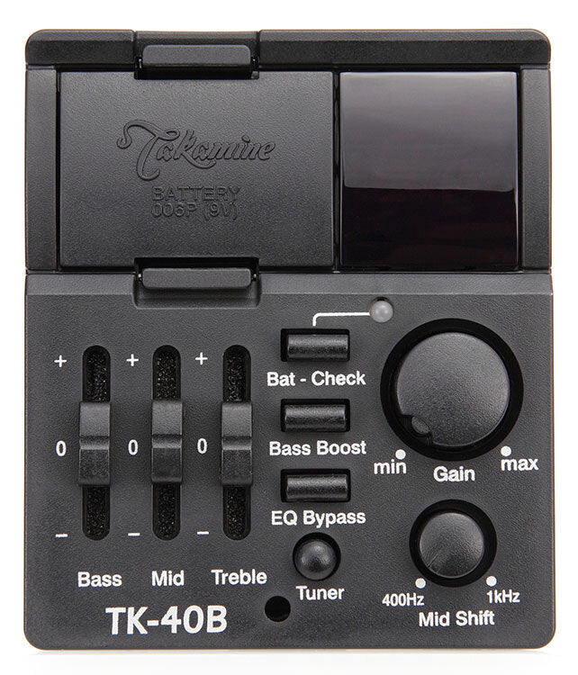 Takamine TK-40B preamp system gives you a built-in tuner, three-band EQ and gain controls, mid-shift control, bass-boost switch and EQ bypass switch for the ultimate in versatility and sound quality.